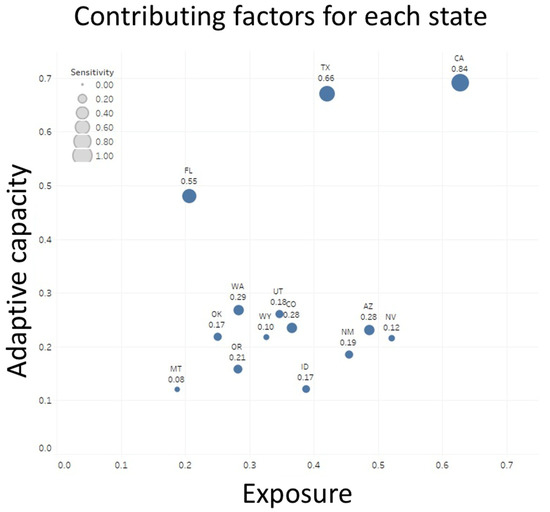 Plot showing the overall contributing factors for each state, indicated by exposure (along the x axis); adaptive capacity (along the y axis); and sensitivity (denoted by the size of the circles).