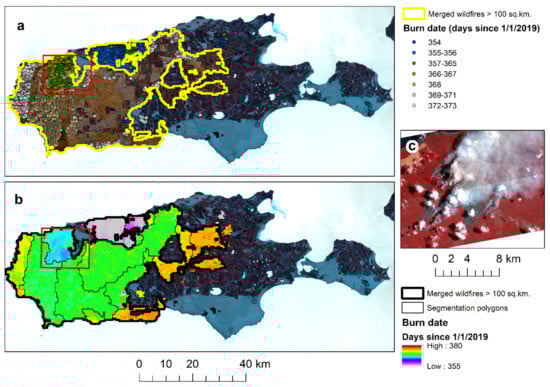 While each fire starts at a certain place from a specific ignition event, there may be several ignition events taking place nearby that are hard to distinguish due to: (1) a wildfire igniting additional wildfires by spot fires as a result of windborne embers [] or by creating pyrocumulonimbus lightning [], and (2) wildfires merging into a larger burnt area. Given that for the analysis in this paper, we aimed to analyze the drivers and behaviour of individual wildfires (similar to [], in their global fire atlas), we created polygons of individual fires using the Segmentation algorithm in TerrSet 18.31 (Clark Labs, ®). The following parameters were used for the segmentation: a window size of 3 pixels, similarity tolerance of 5, weight of mean factor 0.25, weight of variance factor 0.75. The segmentation algorithm was run on all burnt patches with areas larger than 25 km2, and this resulted in 4465 segments across all of Australia (638 were larger than 100 km2). The larger segments were then visually examined and merged into individual wildfires based on their burn date (e.g., adjacent burnt areas that did not belong to the same fire event, based on their dates, were assigned with different ID numbers). Figure 2 presents an example of the methodology followed for the Kangaroo Island fires. Altogether, this resulted in 391 individual wildfires in the fire season of September 2019 to February 2020 in Australia; 65 of these individual wildfires were in SE Australia, and 63 of these, which were forest fires, are the main focus of this study (Figure 1).
