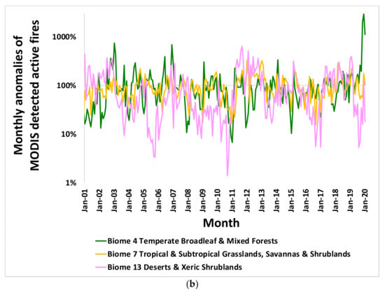 The Black Summer fire season of Australia stood out in the extreme number of forest fires that took place (Figure 4a; 48% of all active fires between Sep 2019 and Jan 2020), with the number of fires in the biome of Temperate Broadleaf & Mixed Forests increasing between Nov 2019 and Jan 2020 by more than 1000% compared with the average monthly active fire numbers for the same months between the years 2001 to 2018 (Figure 4b). During the Black Summer, the fire numbers were also higher than average for the biome of Montane Grasslands & Shrublands (538% more fires than on average) and the biome of Mediterranean Forests, Woodlands & Scrub (470% more fires than on average). The biome of Tropical & Subtropical Grasslands, Savannas & Shrublands (mostly in northern Australia) experienced 74% of the average of active fires between Sep 2019 and Jan 2020, whereas the biome of Deserts & Xeric Shrublands experienced only 33% of its average of active fires (Figure 4b).
