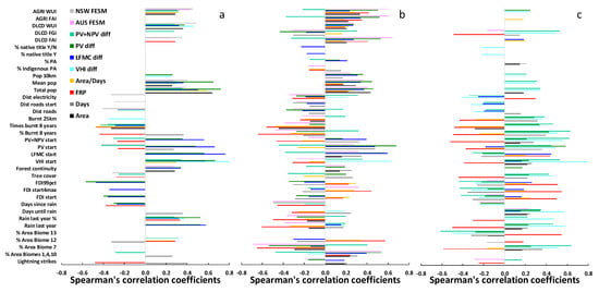 Spearman correlation coefficients between all explanatory variables and the 10 response variables for: (a) the Black Summer forest fires in SE Australia (n = 63, except for NSW FESM severity index, where n = 45); (b) the Black Summer forest fires (n = 205); (c) the Black Summer non-forest fires (n = 186). The colour of the bars indicates the response variable. Only statistically significant correlations are shown.