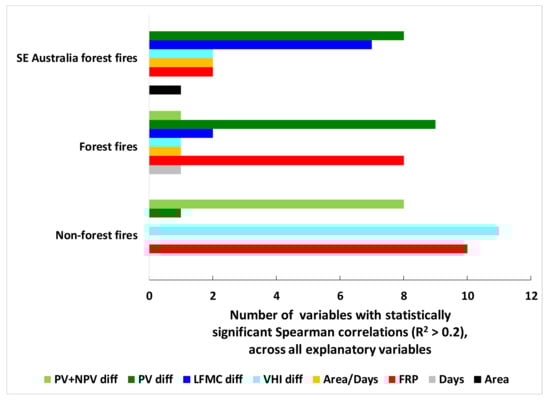 The number of explanatory variables with statistically significant Spearman correlation coefficients (R2 > 0.2) with the response variables for Black Summer non-forest fires (n = 186), Black Summer forest fires (n = 205) and Black Summer forest fires in SE Australia (n = 63). The variables are summarised here based on the response variables.