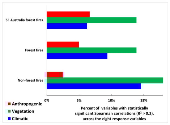 The percentage of explanatory variables (classified into anthropogenic, vegetation or climatic variables) with statistically significant Spearman correlation coefficients (R2 > 0.2) across the eight response variables for Black Summer non-forest fires (n = 186), Black Summer forest fires (n = 205) and Black Summer forest fires in SE Australia (n = 63).
