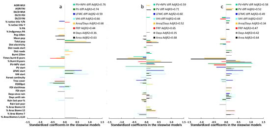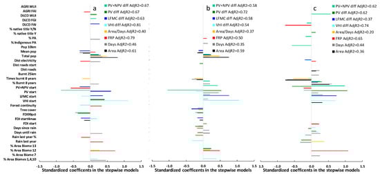 The standardised coefficients of the explanatory variables that were found to be statistically significant in the stepwise regression models for all response variables for (a) the Black Summer forest fires in SE Australia (n = 63); (b) the Black Summer forest fires (n = 205); (c) the Black Summer non-forest fires (n = 186). The models shown in this figure were calculated based on the transformed variables. The adjusted R2 values of each of the stepwise models are shown in the legend. The colour of the bars indicates the response variable. Only statistically significant coefficients are shown.
