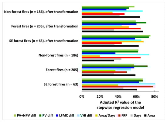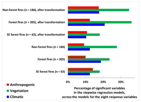 Overall, the stepwise regression models (Figure 10 and Figure 11) were most successful at explaining the response variables for the forest fires in SE Australia (median-adjusted R2 value of 64.3%; Figure 12), followed by all forest fires (median-adjusted R2 value of 55.8%; Figure 12), and all non-forest fires (median-adjusted R2 value of 48.2%; Figure 12). Across all stepwise regression models, the two response variables that were best explained by the explanatory variables were change in PV (median-adjusted R2 value of 69.1%; Figure 12) and change in VHI (median-adjusted R2 value of 66.3%; Figure 12) due to the fire. The two response variables that were least explained by the explanatory variables were the length of the fires in days (median-adjusted R2 value of 38.8%; Figure 12) and area burnt per day (median-adjusted R2 value of 38.5%; Figure 12). On average, vegetation-related variables were most commonly included in the stepwise regression models (2.4 variables on average across the 48 models (8 response variables × 3 subsets × 2 with or without variable transformation)), whereas, on average, 1.8 climatic or anthropogenic variables were included in the stepwise regression models (Figure 13). The relative prevalence of anthropogenic variables was more pronounced in the stepwise models for the forest fires in SE Australia (Figure 13). Amongst all explanatory variables across all regression models (n = 48 models), the following five explanatory variables had, on average, the highest standardised coefficients: number of times there was a fire in the previous 8 years, number of active fires detected in the previous 8 years, and the vegetation conditions before the fire started (LFMC, VHI and PV+NPV). For the stepwise regression models explaining the forest fires in SE Australia (n = 16 models), PV and VHI before the fire started were the two explanatory variables that had, on average, the highest standardised coefficients.