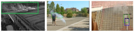 Although the above methods based on the manual feature extraction can identify smoke objects that are obviously different from backgrounds in visual, the anti-interference ability of complex smoke scenes and the detection accuracy of small smoke regions are not satisfactory. In recent years, with the rapid development of artificial intelligence and computer vision technology, the convolutional neural network (CNN) has been successfully applied in image classification, object detection, face recognition, semantic segmentation, and other fields [10,11]. CNN was also used to extract smoke features [12,13]. In order to further improve the computational efficiency, several studies tried to use a smaller convolution kernel in the CNN architecture and canceled the dense full connection layer so as to obtain a high smoke-classification accuracy [14]. Some deep convolution networks were used to determine the location of smoke. For example, the VGG-16 (Visual Geometry Group Network) architecture was applied to locate smoke so as to achieve a better balance between the detection accuracy and time efficiency [15]. An attempt was made to predict the coordinates of smoke objects based on Faster R-CNN (region-based CNN) and realize the end-to-end detection of smoke objects in forest fires [16]. A joint detection framework based on fast R-CNN and 3D-CNN (three-dimensional CNN) was developed to realize smoke target localization [17]. A video smoke detection method based on a deep saliency network is proposed by combining a depth feature map and a saliency map to realize smoke pixel-wise detection [18].
