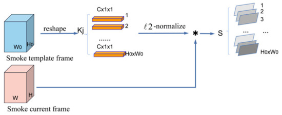 As shown in Figure 3, we define and as the features of the smoke template frame and current frame, respectively, which are extracted by the Siamese encoder, where is the number of feature channels, and and represent the height (width) of the feature maps of the template frame and the current frame, respectively. We first reshape the template feature into and represent the reconstructed template feature set as , which contains features with the size of . Then, by calculating the correlation between the normalized feature in the template frame and the current frame , we obtain the similarity map . As shown in Formula (3). We define as the set of correlation maps, and each element in S represents a similar map.