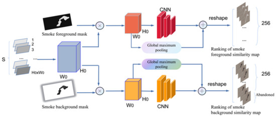 The structure of the smoke-ranking module is shown in Figure 4; the foreground and background masks of the template frame are used to filter the foreground and background similarity maps. Specifically, we exchange the space and channel dimensions of the pixel-wise similarity maps and then multiply them with the foreground or background mask, respectively, to obtain the foreground features and background features. After that, a ranking score is computed to indicate the importance of each similarity map. We calculate the sum of tensors after the channel-wise global maximum pool of tensors to obtain the ranking score. The higher the score, the higher the importance of the corresponding similarity map. The maximum value of the channels of each similarity map represents the probability of the corresponding pixel in the template frame to find a matching pixel in the current frame. Finally, we reshape the ranking score metric into a vector, and rank the maps according to the corresponding scores from largest to smallest. If the number of smoke foreground similarity maps is larger than the target channel size (set to 256), the redundant features are discarded. Otherwise, we need to use zero maps to pad the ranking feature in order that the channel size can be fixed. A similar scheme is also used to build the background similarity maps.