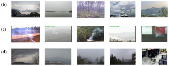 Several samples from the above four datasets. (a) smoke samples from Dataset 1; (b) smoke-like samples from Dataset 2; (c) moke samples from Dataset 3; (d) smoke-like samples from Dataset 4.