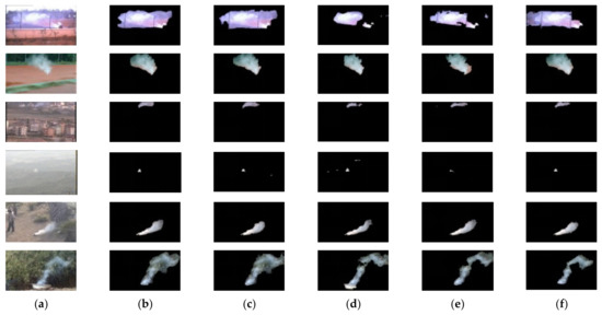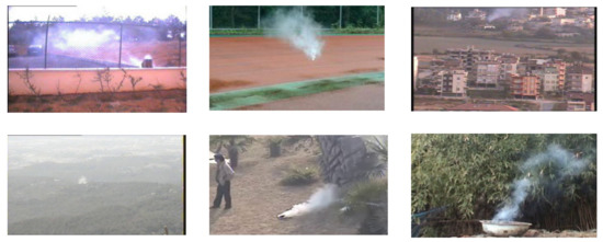 We used part of the data in Dataset 3 to evaluate recognition accuracy; several representative testing samples are shown in Figure 6. Dataset 3 contains different types of smoke regions, such as thin smoke regions caused by smoke diffusion (left image of the first row in Figure 6), distant smoke area (right image of the first row in Figure 6), small smoke area in the fog (left image of the second row in Figure 6), etc. These challenging videos bring great difficulty to smoke region detection.