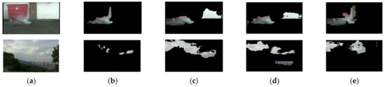In this section, we use the camouflaged videos to evaluate the anti-interference performance of our model. Figure 8 shows the results of two challenging videos. As shown in Figure 8, compared with the other three methods, the proposed method reduces the false detection rate for the complex background and has higher detection accuracy for smoke pixels. For the suspected smoke videos, these four methods all mistakenly detect the interfering pixels as smoke pixels to different degrees, but in contrast, the proposed algorithm has a lower false detection rate. This is because the temporal stream takes into account the spatial consistency and motion contrast in the smoke optical flow image. Furthermore, we integrated temporal and spatial features in order to eliminate static targets with camouflage colors.