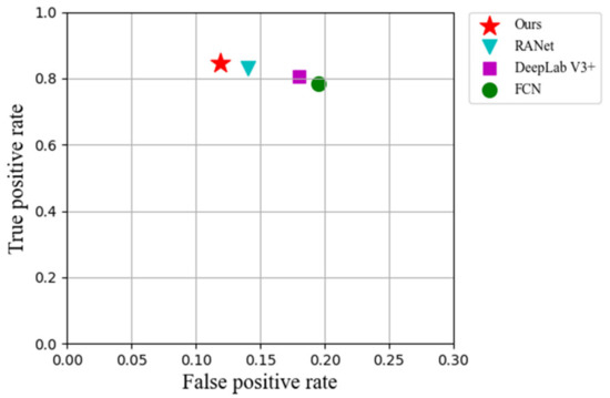 The ROC (receiver operating characteristic) shows the relationship between the false-positive rate and true-positive rate. In this paper, we calculated the number of overlapping smoke pixels in the detection maps and ground truth images as true positives. Similarly, we also determined the number of non-overlapping flame pixels in the detection maps and take those as false positives. Figure 9 shows the ROC space for the four methods. It can be seen that the proposed method maintained a better balance between the true positive rate and the false positive rate than the other three methods.