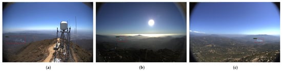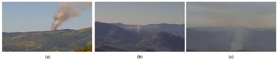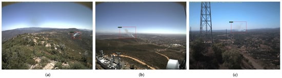 Figure 4 shows three images of sequences that were first detected (with a smoke object) later than 15 min by the model with the best results FRCNN_5000_WUP_3AE. Regarding these negative results, the small dimension of the smoke column (due to the large distance from the lookout) may cause a later first detection as it can be seen Figure 4a, although Figure 5b shows an example of a small fire that was detected early. The saturation of the background of the images may also delay the detection of smoke which is above the horizon as it can be observed in Figure 4b,c. It is noted that examples of early smoke detections have also been represented in Figure 5, which shows three samples with a detection time lower than 5 min.