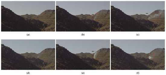 This is an example of a temporal sequence of smoke fire from before the fire stars until 5 images after the beginning of the fire. (a) Example of just before fire starts. Examples (b–f) are consecutive images after the fire starts. The red boxes show the area detected as smoke by our method FRCNN_5000_CYC trained with dataset 3AE. The image sequence was taken on the same day, 10 March 2014, respectively at 9:23, 9:29, 9:36, 9:42, 9:49 and 9:56.