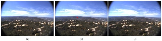 Illustrative examples of the 20180504_FIRE_smer-tcs8-mobo-c video sequence, (a) showing the zero reference from database; (b) showing the fire ignition (see red arrow) with a time reference of 11 min later defined by us and (c) showing the next image, one minute later. The image sequence was taken in the same day, 4 May 2018, respectively at 14:33, 14:44 and 14:45.