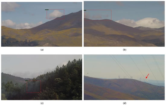 The existence of clouds with similar characteristics to smoke columns may limit the proposed method. Figure 6a shows an example of a correctly identified as a cloud object, while Figure 6b shows an example of an incorrectly identified cloud as an hrz object. The main difference between both objects is the shape and colour, where the first is denser and has whiter shades, while the second is similar to smoke objects, being less dense and with grey shades. Figure 6c shows an example of the morning fog, which can also be interpreted wrongly as a smoke column (in this case it was detected as a mid object. Morning fog objects also have a less dense border and can have similar shapes to smoke columns. Finally, Figure 6d shows an example of a smoke column that was not correctly identified, mainly due to its low visibility, due to background saturation, and the presence of structures (windmill and cables) in front of the smoke column.