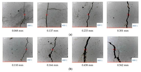 Figure 4 shows the maximum crack width on the test block surface after high-temperature treatment, as measured by a fracture-width tester. The maximum crack of Scoria aggregate concrete at 800 °C is 0.301 mm, which is 4.43 times higher than that at 200 °C. The maximum crack of normal concrete at 800 °C is 0.562 mm, which is 5.11 times higher than that at 200 °C. The maximum crack width for normal concrete was up to 1.87 times greater than that of the Scoria aggregate concrete.