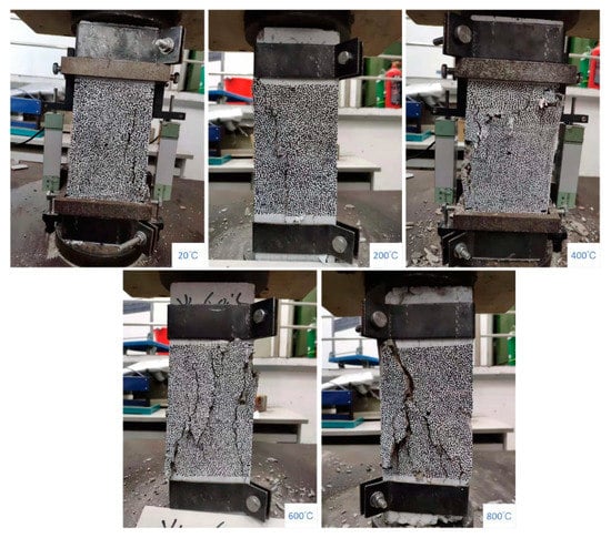 Figure 5 shows similar patterns of diagonal shear cracking and splitting cracking for the uniaxial compressive damage to the Scoria aggregate concrete specimens treated at different temperatures. The specimens were in the elastic stage at the beginning of loading. The load and displacement increased linearly, and there were no noticeable features on the specimen surfaces. As the load increased, internal microcracks gradually formed, and the specimen stiffness began to decrease. The load increased to a peak, beyond which cracks parallel to the force direction appeared on the surface of the specimens. When the load was reduced to 60–70% of the peak load, the axial deformation of the concrete block continued to increase and eventually resulted in the destruction of the specimens. The Scoria aggregate concrete specimens showed more noticeable brittle damage than the conventional concrete specimens, with fewer cracks on the specimen surface and less transverse deformation.