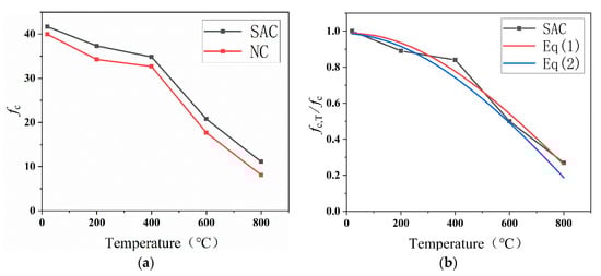 where fcs,T and fcs are the axial compressive strength of SAC at high temperature and at room temperature, respectively (MPa); fcn,T and fcn are the axial compressive strength of NC at high temperature and at room temperature, respectively (MPa); and T is the temperature, °C. The R2 value in Equation (1) is 0.957. The R2 value in Equation (2) is 0.946.