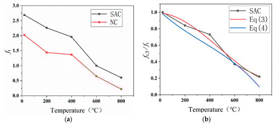 where fts,T and fts are the splitting tensile strength of SAC at high temperature and at room temperature, respectively (MPa); ftn,T and ftn are the splitting tensile strength of NC at high temperature and at room temperature, respectively (MPa), and the R2 value in Equation (3) is 0.961. The R2 value in Equation (4) is 0.931.