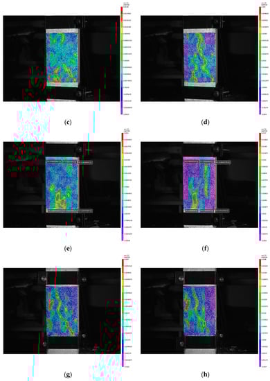 Strain nephogram of SAC: (a) 200 °C 80% peak strain; (b) 200 °C peak strain; (c) 400 °C 80% peak strain; (d) 400 °C peak strain; (e) 600 °C 80% peak strain; (f) 600 °C peak strain; (g) 800 °C 80% peak strain; (h) 800 °C peak strain.