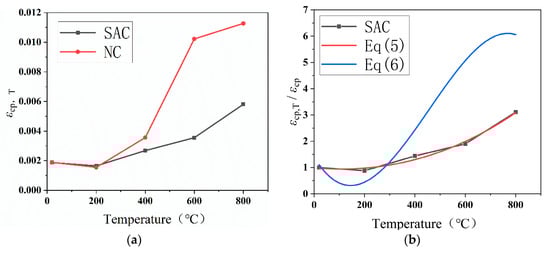 where εcps,T and εcps are the peak strain of SAC at high temperature and at room temperature, respectively (MPa); εcpn,T and εcpn are the peak strain of NC at high temperature and at room temperature, respectively (MPa); and the R2 value in Equation (5) is 0.9763. The R2 value in Equation (6) is 0.954.
