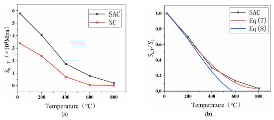 where Scs,T and Scs are the secant modulus of SAC at high temperature and at room temperature, respectively (MPa); Scn,T and Scn are the secant modulus of NC at high temperature and at room temperature, respectively (MPa), and the R2 value in Equation (7) is 0.9908. The R2 value in Equation (8) is 0.989.