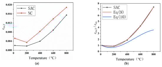where εcus,T and εcus are the ultimate strain of SAC at high temperature and at room temperature, respectively (MPa); εcun,T and εcun are the ultimate strain of NC at high temperature and at room temperature, respectively (MPa); and the R2 value in Equation (9) is 0.9996. The R2 value in Equation (10) is 0.993.