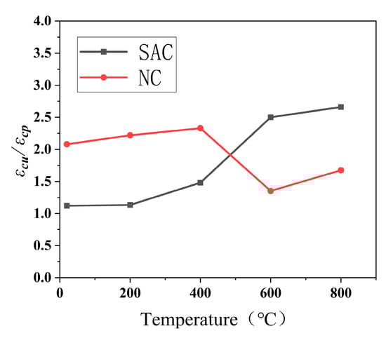 Different indicators are used in the literature to quantitatively evaluate the deformation capacity of concrete. The ratio of strain at 50% of the peak stress to the peak strain of concrete (εcu/εcp) was used to evaluate the deformation capacity of the concrete specimens under the action of axial pressure in this study. The larger the ratio is, the higher the deformation capacity of the specimen is. Figure 12 shows how εcu/εcp varies with temperature. Compared to that of the Scoria aggregate concrete, the deformation capacity of the conventional concrete was higher below 400 °C and lower (by approximately half) above 600 °C. Thus, the Scoria aggregate concrete performed better and had a more stable structure than the conventional concrete under high-temperature conditions.