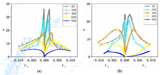 Figure 8 shows the strain distribution from the DIC image of the peak strain and 80% peak strain of the Scoria aggregate concrete at different temperatures. It can be seen that the strain values gradually increased as the temperature increased. As shown in Figure 8b, for the specimen with the lower temperature, when the peak strain was reached, only the transverse strain concentration zone appeared at the bottom of the specimen, and no cracks appeared in the middle of the specimen. For the specimens subjected to higher temperatures, when the peak strain was reached, transverse strain concentration zones appeared at the top and bottom of the specimens, and these strain concentration zones were connected to form cracks, leading to damage of the specimen. The cracks were consistent with the failure mode of the test block in Figure 5, mainly diagonal shear cracking and splitting cracking, as shown in Figure 8h.