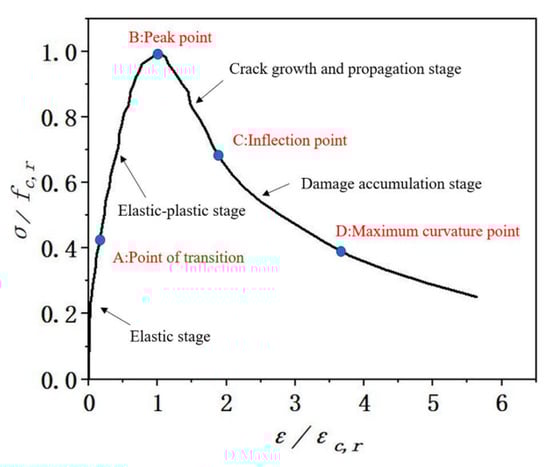 Similar normalized stress-strain curves were obtained for the Scoria aggregate concrete and the conventional concrete, and these curves were divided into four stages, as shown in Figure 14.
