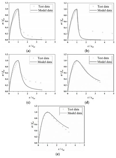 The experimental data were regressed to obtain n and α for the Scoria aggregate concrete at different fire temperatures. The results are shown in Table 7. Figure 15 is a comparison of Equations (11) and (12) with the experimental curves that were used to validate the proposed constitutive model. In the ascending phase, the normalized stress-strain curves at different temperatures have nearly the same shape with only slight changes in n. The descending phase is very steep at lower temperatures, where the Scoria aggregate concrete was brittle and had poor ductility. The α value was large at lower temperatures and gradually decreased as the temperature increased. The R2 value reached approximately 0.8. Thus, the constitutive model effectively reproduced the complete test stress-strain curve.