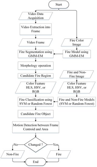 The fire detection system starts by forming a color probability model for the segmenting fire region using the Gaussian Mixture Model and Expectation Maximization (GMM-EM) methods. Then, the model is trained based on a dataset containing varying fire colors. This model would find the fire region candidates in the video frames extracted from the video input. After obtaining the candidates, the machine learning strategies were performed for verifying them based on the color histogram (e.g., HSV, YCbCr, or RGB). This research utilized two machine learning methods: support vector machine (SVM) and random forest (RF). SVM is used because of its ability to classify an object into two classes linearly. On the other hand, RF was chosen because of its ability to combine color and motion features in object classification. However, these two methods will be compared in implementation to obtain the most optimal framework. Lastly, further verification was then conducted by checking the motion of fire regions. The fire motion was measured according to the centroid and the area of the region. If the method detects irregular motion in a fire region, then this region was assigned as a fire object and vice versa. The detailed proposed framework is shown in Figure 1.