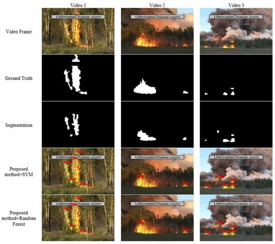 Next, an evaluation to determine the optimal machine learning was carried out. Table 3 and Table 4 show the evaluation results for support vector machine and random forest, respectively. As shown in Table 3, the utilization of SVM with the linear kernel was more accurate than the RBF and polynomial. Since only two classes were separated, the linear kernel in the form of straight lines was more accurate than RBF kernels and polynomials. Unfortunately, as shown in Table 4, the random forest with 20 trees achieved better results than SVM. In both machine learning methods, the HSV model was slightly better than the YCbCr model due to HSV separating luma (image intensity) from chroma (color information). It is beneficial in various situations, especially in natural objects like trees, fire, etc. Therefore, a random forest with 20 trees on the HSV color model was applied for our fire detection framework in the testing stage. Figure 6 shows an example of the results on each step of fire detection.