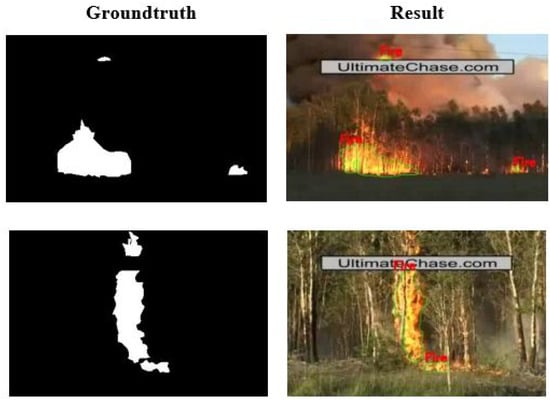 The proposed method was tested on several public datasets. The proposed method was implemented using the Python programming language on a Core i3 CPU and 8GB RAM. In the experiment, the true-positive rate (TPR), the true-negative rate (TNR), the false-positive rate (FPR), the false-negative rate (FNR), the intersection over union (IoU) rate, as well as the processing time were evaluated. The TPR is the ratio between the number of correctly detected fire frames and the number of ground truth fire frames. The TNR is the ratio between the number of correctly detected non-fire frames and the number of ground truth non-fire frames. The FPR is the ratio between the number of wrongly detected fire frames and the number of ground truth non-fire frames. Lastly, the FNR is defined as the ratio between the number of improperly detected non-fire frames and the number of ground truth fire frames. The IoU rate evaluated how well the method localizes the fire. TPR and FNR values were used to assess video containing the fire, while TNR and FPR values were used for video without fire. Lastly, the frame rate measures the method’s effectiveness, also referred to as frames per second (FPS).