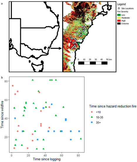 Location of the study area in south-eastern Australia (left), the individual plots within it and the severity of the 2019–2020 wildfires (right) (a). Severity mapping sourced from State Government of NSW Department of Planning‚ Industry and Environment [33]. Time since the last logging event, wildfire and hazard reduction fire prior to the 2019–2020 wildfires at the time of the post fire surveys for all 59 sites (b).