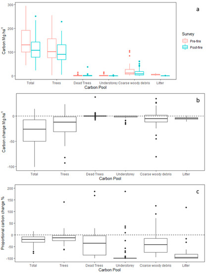 Distribution of measured above ground carbon stocks from the pre- and post-fire surveys (a), the change in above ground carbon stocks between the two surveys (b) and the proportional change in above ground carbon stocks between the two surveys in each carbon pool (c). Distributions are represented by the median (centre line of the box), the 25th and 75th percentile (lower and upper limits of the box respectively), the 2.5th and 97.5th percentiles (lower and upper limits of the whiskers respectively) and outliers (individual points). Nine outliers from the dead tree pool and seven outliers from the coarse woody debris pool were removed as they exceeded 200% and made visualization of the remaining data difficult.