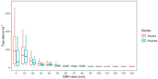 Distribution of live tree stem densities in 10 cm DBH classes from the pre- and post-fire surveys. Each box and whisker represents the variation in live tree stem abundance across all 59 plots for the given survey and stem class. Distributions are represented by the median (centre line of the box), the 25th and 75th percentile (lower and upper limits of the box respectively) and the 2.
