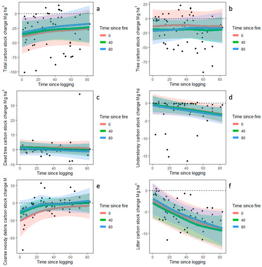 Change in above ground carbon stocks between the pre- and post-fire carbon surveys plotted against time since logging and time since the previous wildfire for total (a), live tree (b), dead tree (c), understorey (d), coarse woody debris (e) and litter (f) carbon stocks. in each of the carbon pools. Solid lines and transparent ribbons indicate the median and 90% posterior density intervals respectively fitted by three levels of time since wildfire with observed values (black dots). Predictions were made with fire severity fixed at ‘high’, topographic position at ‘Slope’, time since hazard reduction at 10–35 years and all other variables at their mean.