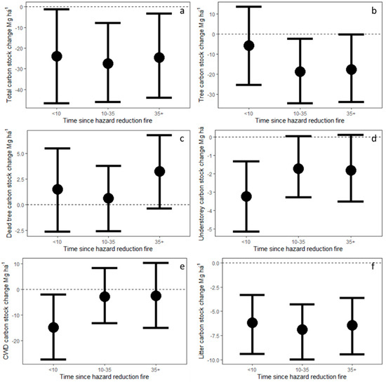 Change in total (a), live tree (b), dead tree (c), understorey (d), coarse woody debris (e) and litter (f) carbon stocks between the pre- and post-fire carbon surveys in response to time since the last hazard reduction fire. Central point and bounds indicate the median and 90% posterior density intervals respectively. Predictions were made with time since logging and time since fire at 40 years, fire severity fixed at ‘high’, topographic position at ‘Slope’ and all other variables at their mean. CWD = coarse woody debris.