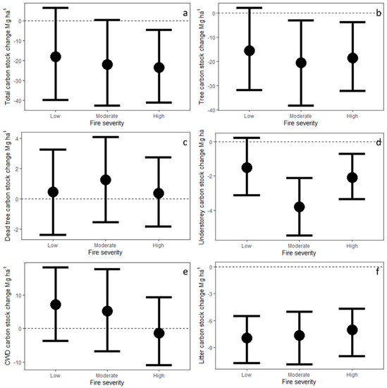 Change in total (a), live tree (b), dead tree (c), understorey (d), coarse woody debris (e) and litter (f) carbon stocks between the pre- and post-fire carbon surveys in response to the severity of the 2019–2020 wildfire. Central point and bounds indicate the median and 90% posterior density intervals respectively. Predictions were made with time since logging and time since fire fixed at 40 years, topographic position at ‘Slope’, time since hazard reduction at 10–35 years and all other variables at their mean.