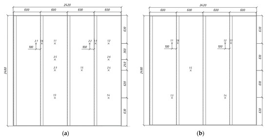 The furnace temperature was determined by means of twelve thermoelectric transducers with a switching head uniformly distributed at a distance of approximately 100 mm from the exposed side of the test sample according to IMO Res. A.754 (18) [26]. The temperature in the furnace during the fire tests was maintained according to the appropriate temperature regimes [23]. The temperature on the test samples was measured by cable thermoelectric chromel–alumel thermocouples. According to the test reports of the structure, each thermocouple is inserted through a steel pipe of standard weight, and the end of the pipe from which the welded junction protrudes is to be open. The thermocouple junction protrudes ½ in (12.7 mm) from the open end of the pipe.
