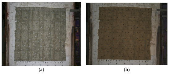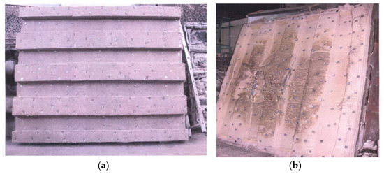 The H-class bulkheads’ appearance before and after the fire test did not change, and the deflection at the center of the bulkheads did not reach the limit value of l/20 in each test [27]. For example, the heated and unheated sides before and after the fire test of H-120 bulkheads (Figure 4 and Figure 5) and mineral wool after the fire test of H-120 and H-0 bulkheads (Figure 6) are shown.