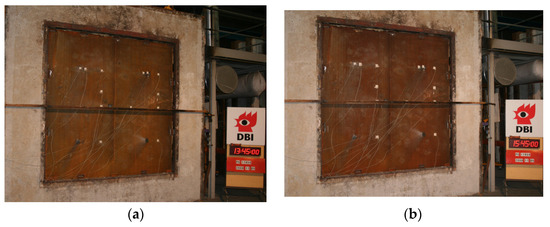 Considered A-class bulkheads did not change their appearance before and after the fire test, and the deflection at the center of the bulkheads did not reach the limit value of l/20 in each test [27]. For example, the heated and unheated sides after the fire test of the A-15 bulkhead are shown (Figure 7).