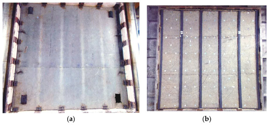 (a) Deck H-120 before the fire test. (b) Deck H-120 after the fire test.
