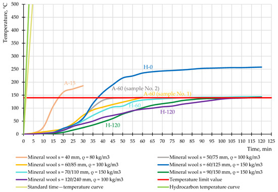 The temperature–time dependences at the thermocouple location on the unheated surface were obtained for H-class bulkheads and deck H-120 (Figure 11).