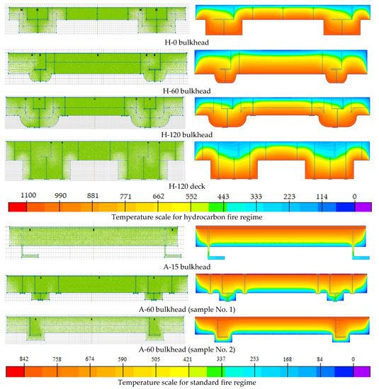 As a result of the simulation, visualizations of the heating of the experimental bulkheads and deck were obtained (Figure 10). The location of the thermocouples on the structures is shown in the analytical model. Each analytical model represents ¼ of the structure since it consists of similar and repeating fragments. For H-class bulkheads and H-120 deck, the fire exposure was from the mineral wool side, and for A-class bulkheads, from the steel plate side.
