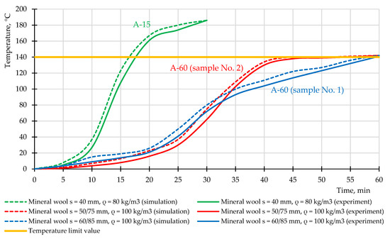 Analysis of Figure 12 shows that the graph for the A-15 bulkhead grows more rapidly because the bulkhead warms up faster due to the fact that it has a smaller plate thickness (40 mm) and a lower density (80 kg/m3) while the A-60 bulkheads have higher values: density 100 kg/m3 and plate thickness 60/85 mm for sample No. 1 and 50/75 mm for sample No. 2. Samples No. 1 and No. 2 for A-60 bulkheads with a density of 100 kg/m3 have similar dynamics of temperature increase up to 30 min, then sample No. 1 continues to heat uniformly, while sample No. 2, which has a plate thickness of 10 mm less than the thickness of sample No. 1, increases sharply and reaches equilibrium state after 40 min of heating.