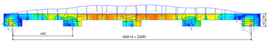In the example of the H-0 bulkhead, the deflection in the center of the considered structure under the thermal load was calculated in SP ELCUT using the connection of tasks of unsteady heat transfer and mechanical stresses and strains, which resulted in a deformation diagram shifted by 63 mm relative to the original position (Figure 13).