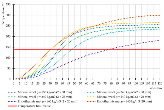 Analysis of Table 5 shows that the best characteristics (the lowest thermal conductivity in the range from 0 to 1000 °C) to perform the functions of fire protection and thermal insulation have material 1 (Rockwool). As stated in Section 2, the heat capacity values were given the same and averaged for all types of mineral wool due to the lack of accurate data at elevated temperatures from manufacturers.