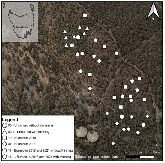 Distribution of sample sites across the Domain with type of treatment applied. Aerial imagery was taken in the years previous to the 2018 fire [34].